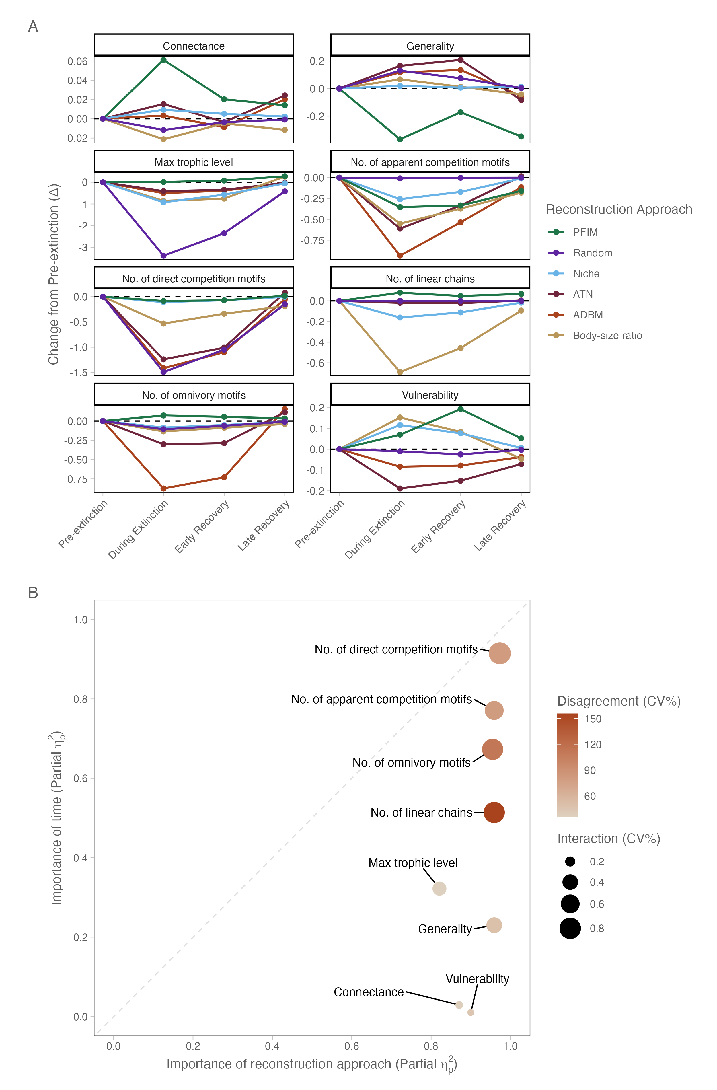 To identify which specific structural properties drive the multivariate separation observed above, we partitioned variance at the level of individual network metrics. Results show that reconstruction choice exerted a significantly stronger influence on network topology than the ecological signal of species loss. In panel A of Figure 2 it is clear that for certain network metrics reconstruction approaches predict different responses across time e.g., connectance, as well as differing magnitudes of change e.g., the number of apparent cmpetition motifs. A two-way factorial ANOVA across all eight network metrics confirmed that the reconstruction approach was the dominant driver of variance, with partial eta-squared values (\(\eta^{2}_{p}\)) consistently exceeding 0.82 and reaching 0.97 for meso-scale motifs (Figure 2, panel B; Table S3). While the extinction event (time bin) significantly altered network structure (p<0.001), its relative importance remained secondary, typically explaining a smaller fraction of the total topological variation. This is clear in panel B of Figure 2 where all metrics are within the bottom-right (reconstruction approach-dominated) quadrant of this space, emphasising that framework assumptions outweigh the ecological signal of species loss. Furthermore, the high inter-reconstruction approach Coefficient of Variation (CV) observed for some metrics (Table S4, Figure S4) highlights a sensitivity. The properties that are influenced by time are also those upon which the reconstruction approaches disagree most profoundly. Demonstrating that our understanding of structural food web collapse in the fossil record is highly contingent on the chosen reconstruction framework, particularly when examining complex trophic pathways beyond simple macro-scale properties like connectance.