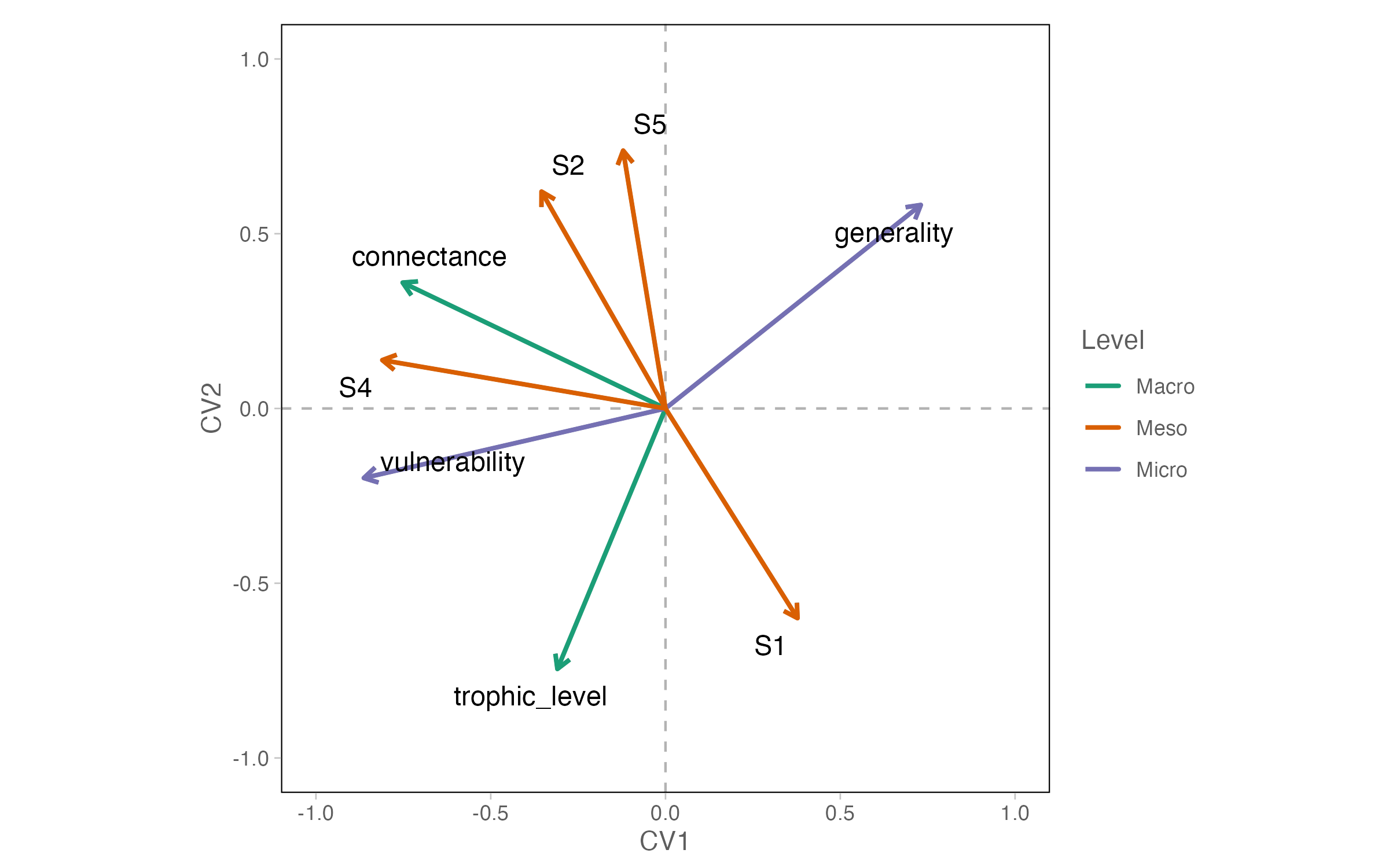 Canonical loadings for the first two canonical variates (CV1, CV2) from the canonical discriminant analysis of network metrics. Arrows indicate the contribution of each metric to the multivariate separation among reconstruction models. Colours denote the scale of each metric: Macro (green), Meso (orange), Micro (purple). Metric labels are shown for the most influential variables.